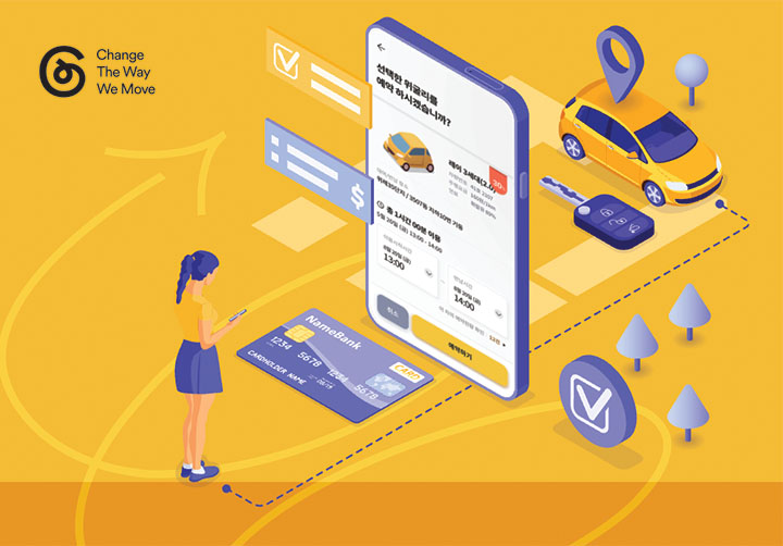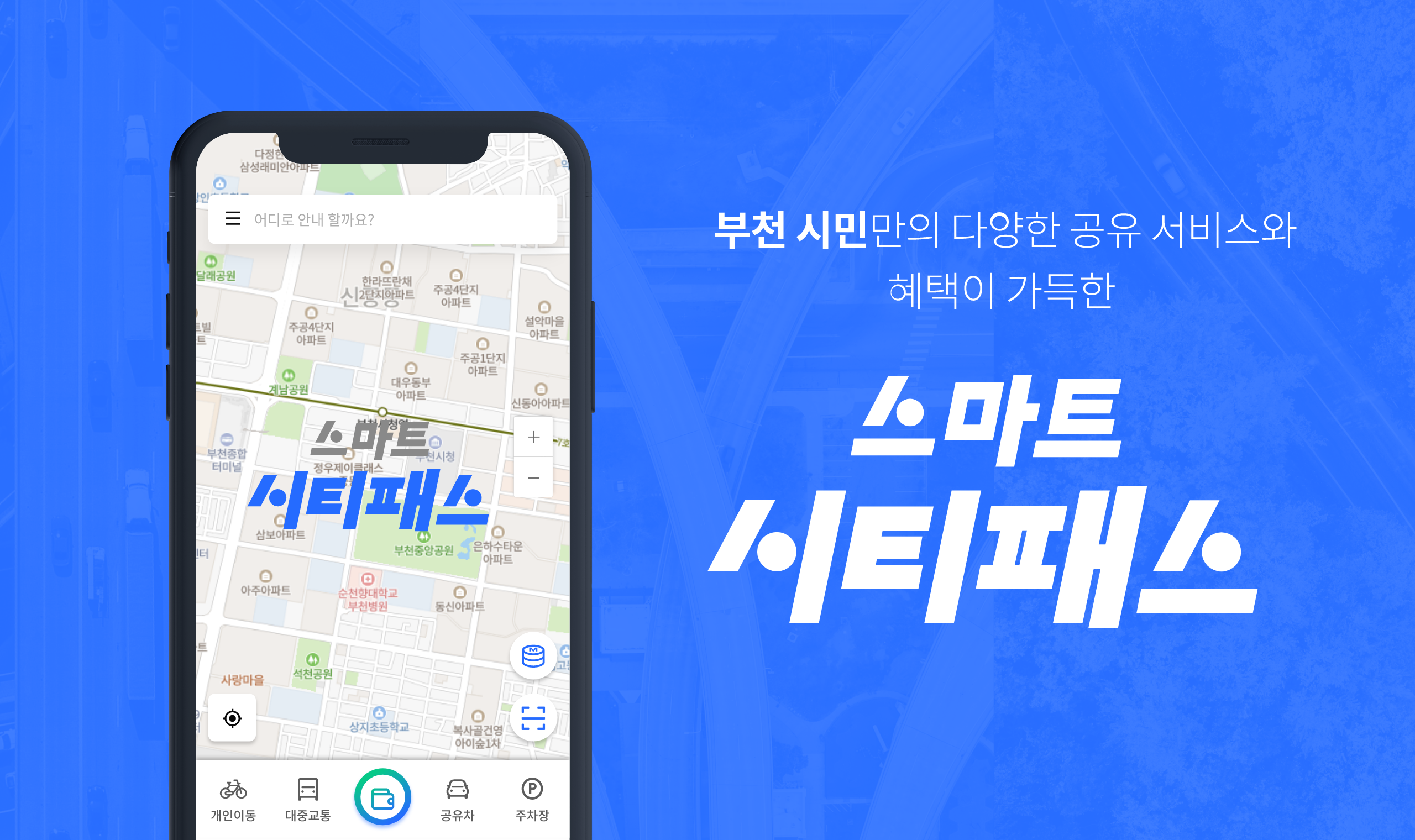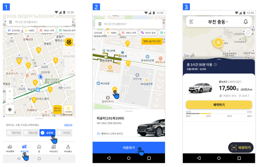①스마트 시티패스 앱 하단에 있는 [마이교통]을 누르고, [공유차]를 선택하면 지도 위에 공유차 마커가 표시되며, 원하는 위치의 공유차 마커를 클릭합니다.