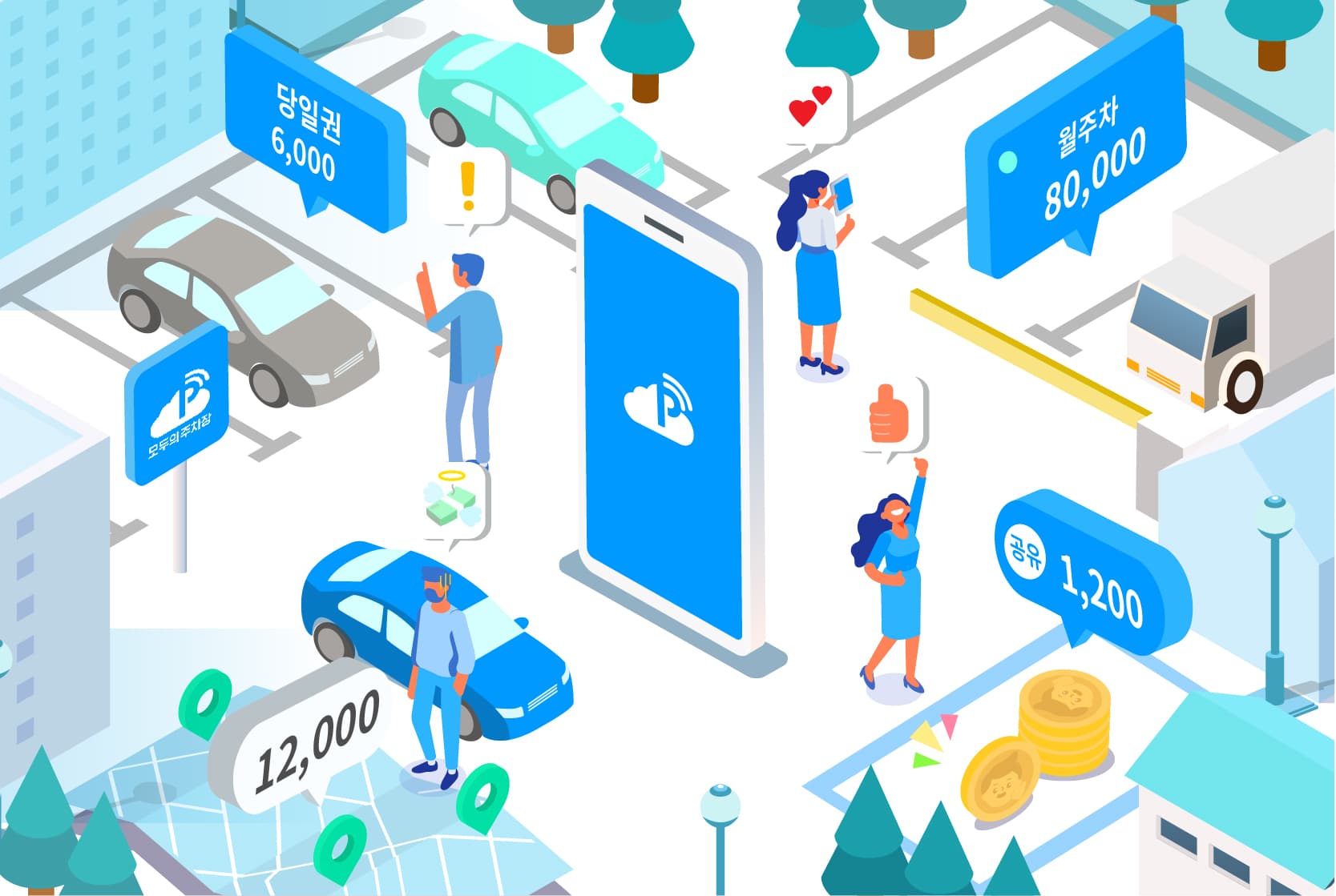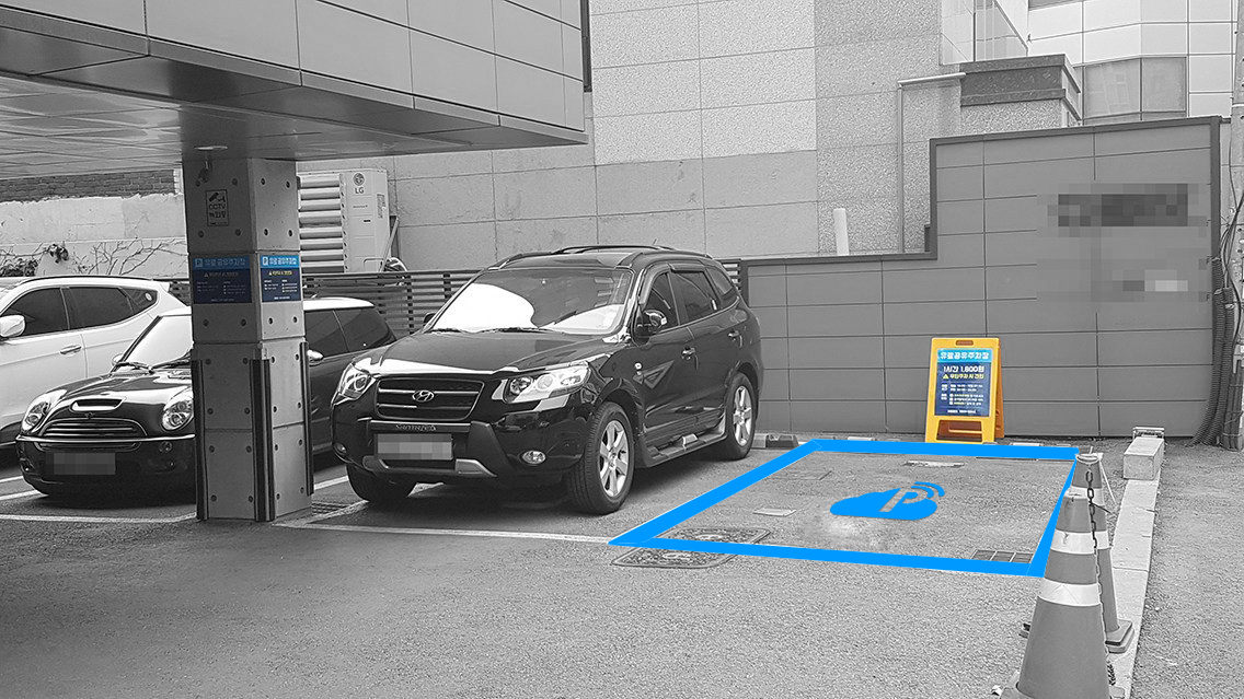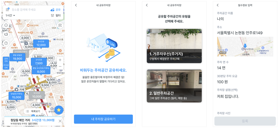 ①스마트 시티패스 앱 하단에 있는 [마이교통]-[주차장]을 누르면 보이는 [공유등록] 버튼을 클릭합니다.