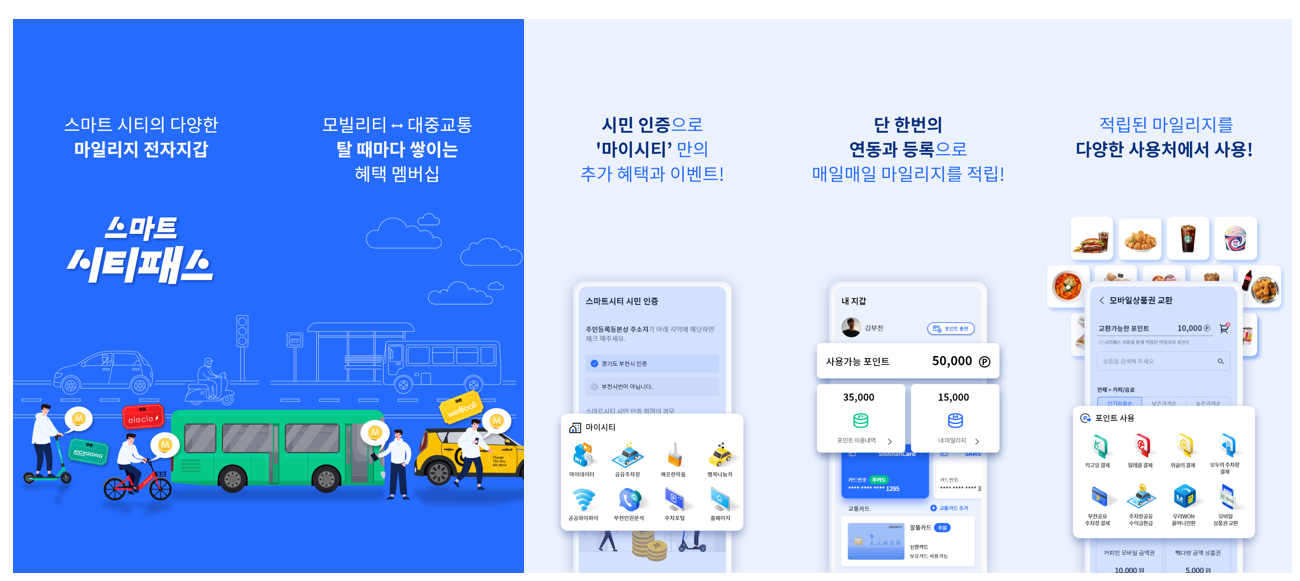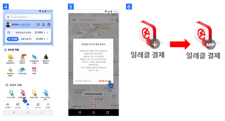 ④스마트 시티패스 앱 홈 메뉴에서 ‘포인트 사용‘ 중 [일레클 결제] 로고를 클릭합니다.