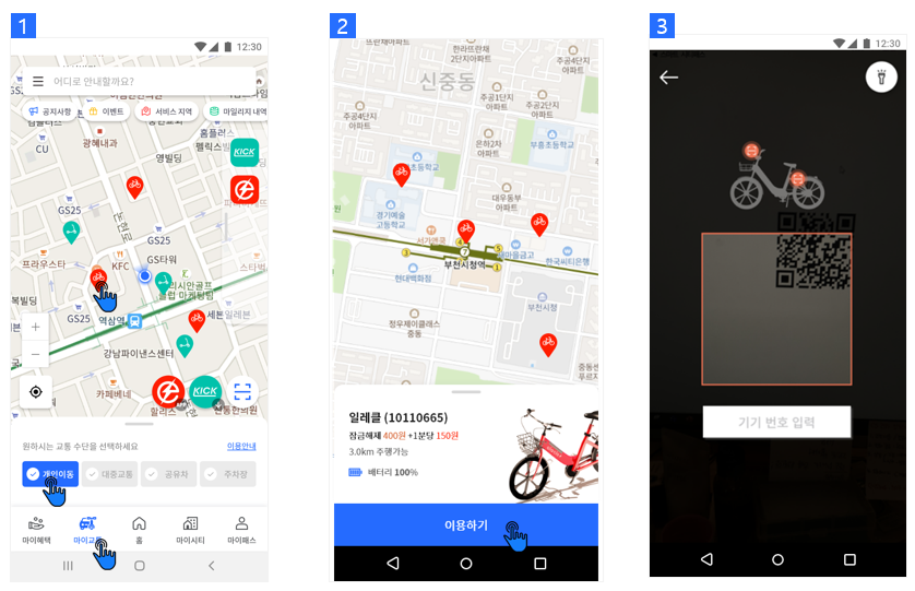 ①스마트 시티패스 앱 하단에 있는 [마이교통]을 누르고, [개인이동]을 선택하면 지도 위에 나오는 킥보드 위치 마커 중 원하는 위치의 마커를 선택합니다.