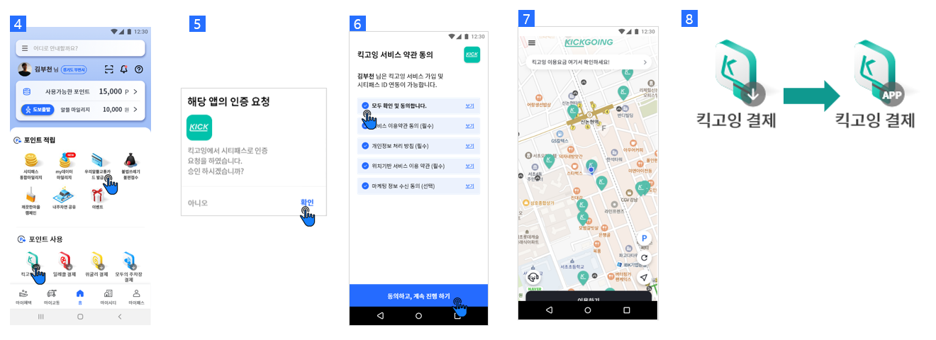 ④ 스마트 시티패스 앱 홈 메뉴에서 ‘포인트 사용‘ 중 [킥고잉 결제] 로고를 클릭합니다.