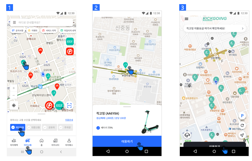 ⑦ 킥고잉 앱이 정상적으로 실행되어 킥고잉 앱의 메인 화면(지도)가 나오면 연동 완료!