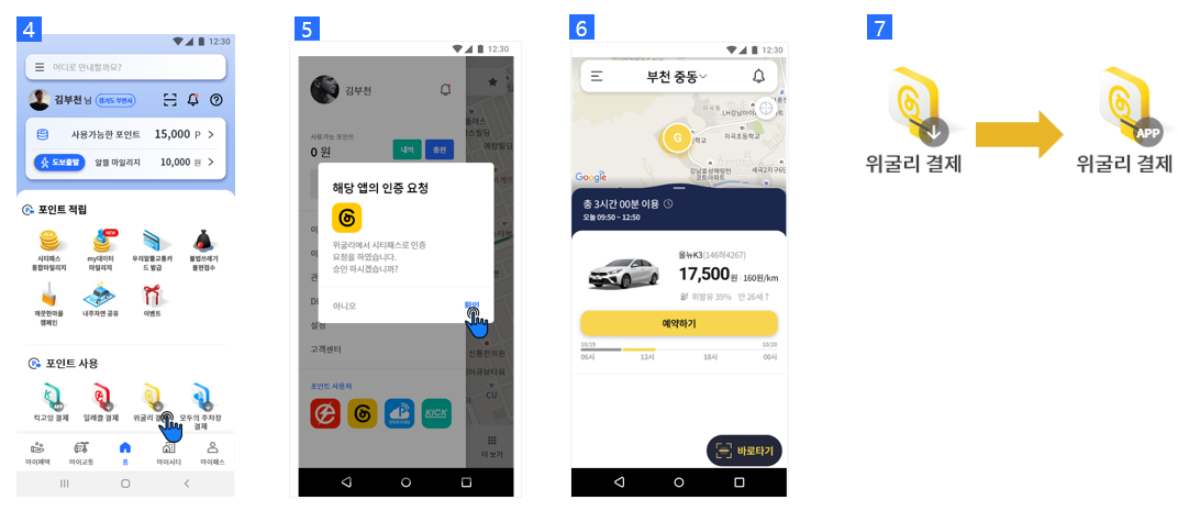 ④스마트 시티패스 앱 홈 메뉴에서 ‘포인트 사용‘ 중 [위굴리 결제] 로고를 클릭합니다.