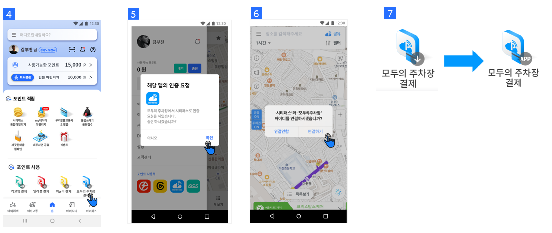 ⑥모두의주차장 앱이 정상적으로 실행되어 연동에 대한 팝업이 뜨면 [연결하기] 버튼을 클릭합니다.