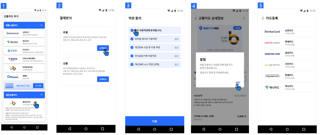 ⑤신한/롯데/삼성/국민/현대/하나 카드사 중 사용중인 카드의 카드정보를 입력하여 등록하면 후불 교통카드 등록이 완료됩니다.