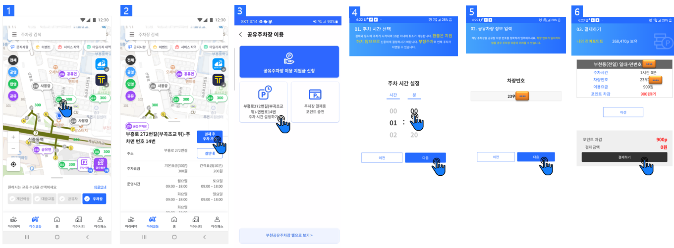 ①스마트 시티패스 앱 하단에 있는 [마이교통] – [주차장]을 클릭하면 지도 위에 주차장 마커가 표시됩니다.